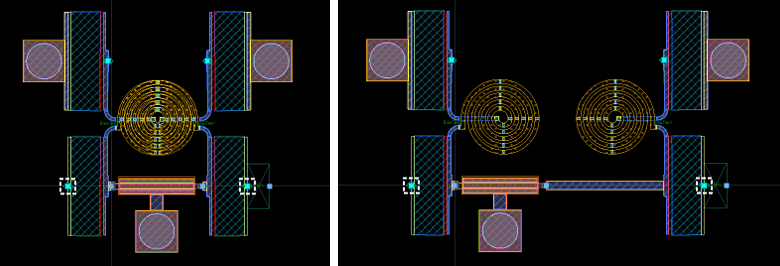 Figure 4: Figure on the left has two inductors overlapping. Such an overlap can occur when going from schematic to layout or during layout optimization. Figure on the right shows the overlap resolved. Overlap resolution can be automated.
